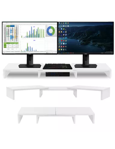 This wooden monitor stand lets you install two computer monitors comfortably. It raises your monitor(s) to eye level and optimizes your working experience. Additional space under the stand allows you to store accessories such as keyboard, mouse, CPU and more.