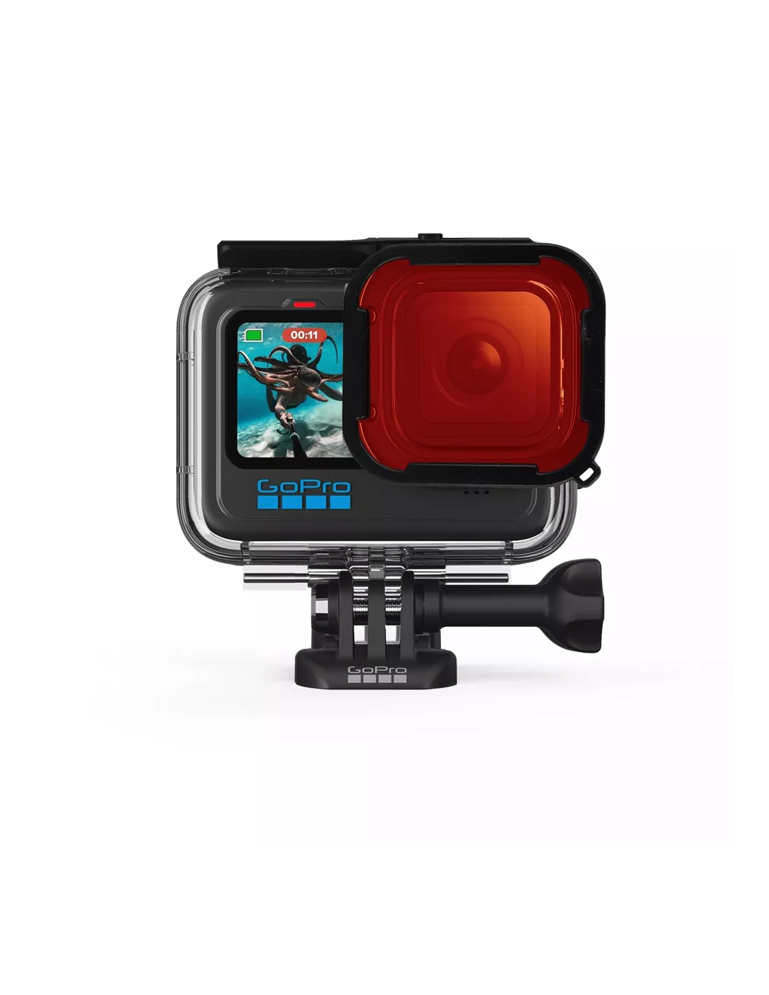 The red filter quickly clips onto the waterproof housing for quick, tool-free installation and removal.